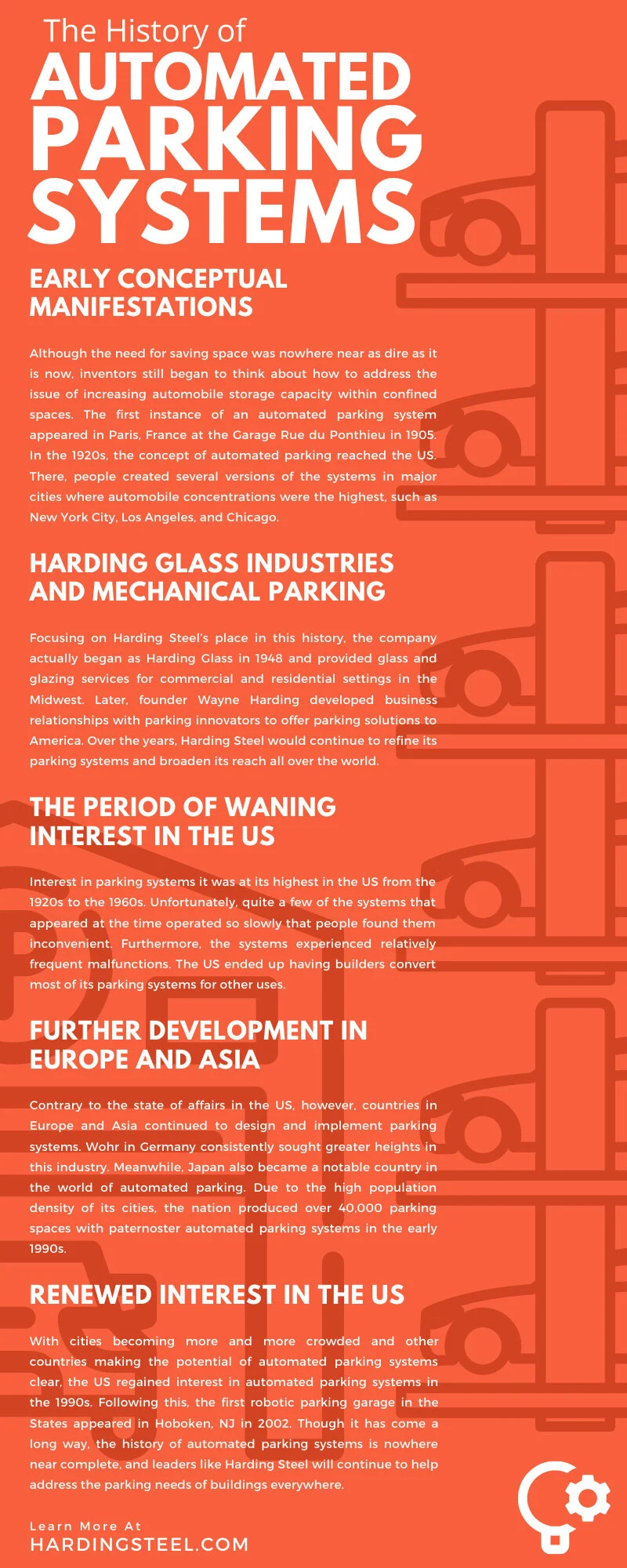 With cities becoming more and more crowded and other countries making the potential of automated parking systems clear, the US regained interest in automatic car parking systems in the 1990s. Following this, the first robotic parking garage in the States appeared in Hoboken, NJ in 2002. With its own long-standing experience and expertise in the field of parking systems, Harding Steel partnered with Wohr Autoparksysteme GmbH in 2015 to bring state-of-the-art and customizable parking solutions to US buildings and parking areas. In certain situations, mechanical lifts and semi-automated systems may make the most sense, so these remain prevalent. At the same time, automated parking systems now utilize advanced software and hardware to operate without drivers present in a variety of configurations. They have horizontally moving conveyor arrangements, vertical towers, and Storage Retrieval Systems (SRUs) that place cars in shelf structures. Though it has come a long way, the history of automated parking systems is nowhere near complete, and leaders like Harding Steel will continue to help address the parking needs of buildings everywhere.